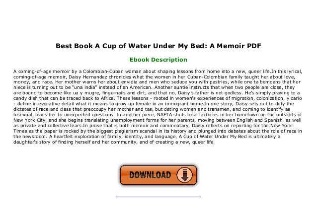 Read Free Ebook Now http//onlybooksxyz/?book= Download A Cup of Water Under My Bed A Memoir Ebook Free Posted 5 years ago in lifestyleA Cup of Water Under My Bed is a 14 memoir by bisexual, ColombianCuban author Daisy Hernández about race, money, sexuality, love, and family She recounts growing up as a woman in a household of immigrants through a thematic, rather than chronological, account of her childhood and adolescenceOct 05, 14 · My first impression of "A Cup of Water Under My Bed" led to heavy sighing It starts with a dismaying tale of invisibility and poverty, which made me think I had another pityparty memoir in my hands Ach, I was wrong